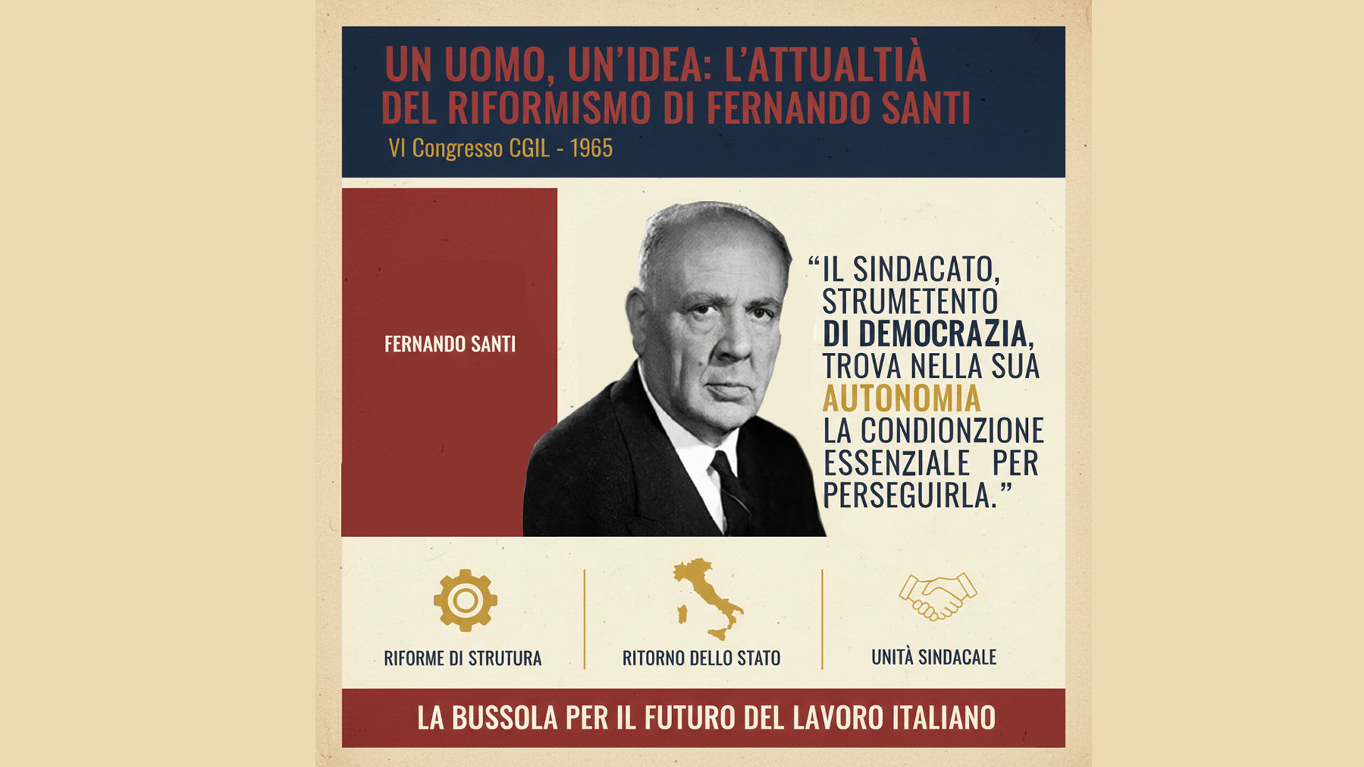 Il discorso di commiato di Fernando Santi dalla CGIL, svolto nel 1965 durante il VI Congresso nazionale, riassume perfettamente la sua concezione del sindacato: uno “strumento naturale di democrazia” che trova nella sua autonomia la condizione essenziale per perseguirla.